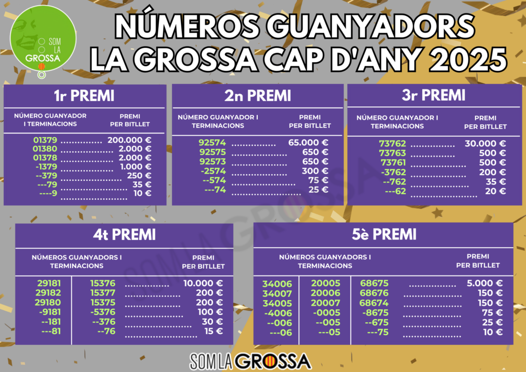 Aquest és un comprovador propietat de SOMLAGROSSA.CAT, amb informació facilitada per Loteries de Catalunya, i les dades resultants estan verificades internament. Els resultats oficials es poden consultar a la web oficial de LOTERIES DE CATALUNYA. Per l’assignació de premis només serà vàlid el contingut del Sistema Informàtic Central de LOTERIES DE CATALUNYA, que no es responsabilitza de qualsevol altra publicació diferent, sigui quin sigui la seva procedència o origen.